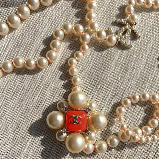 Chanel CC Logo Pearls Orange Stone Vintage 42” Long Necklace