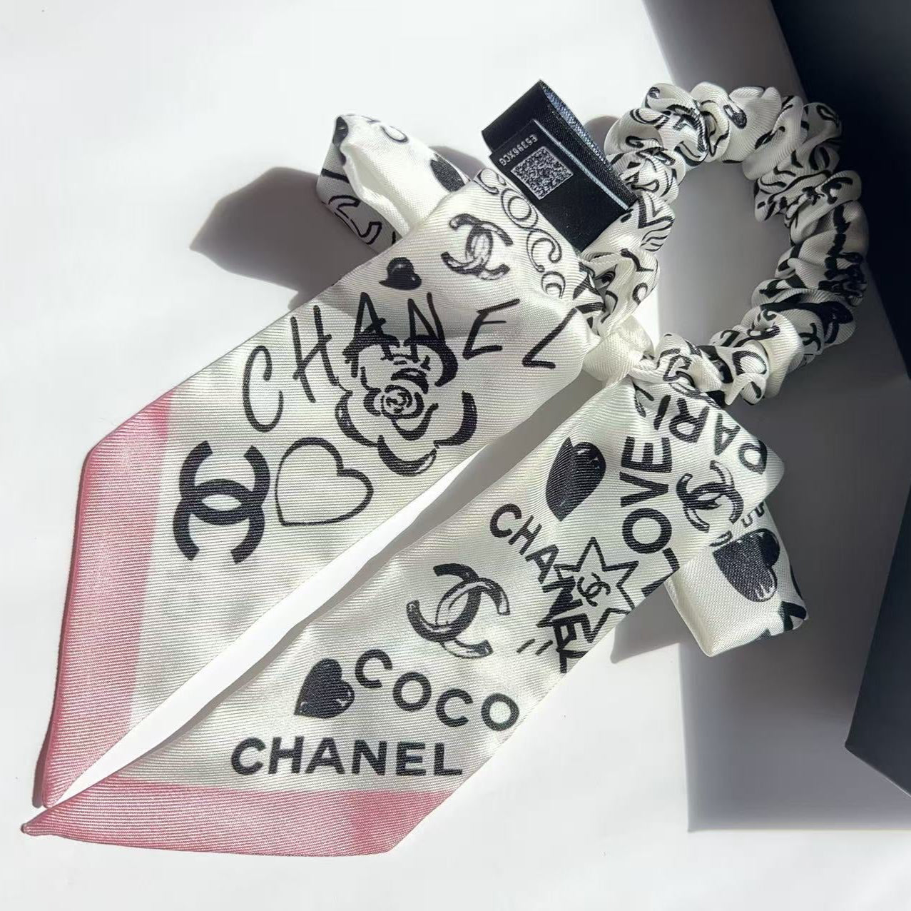 Chanel White, Pink and black Chanel 2023 Silk CC Silk Bow Hair Scrunchie.