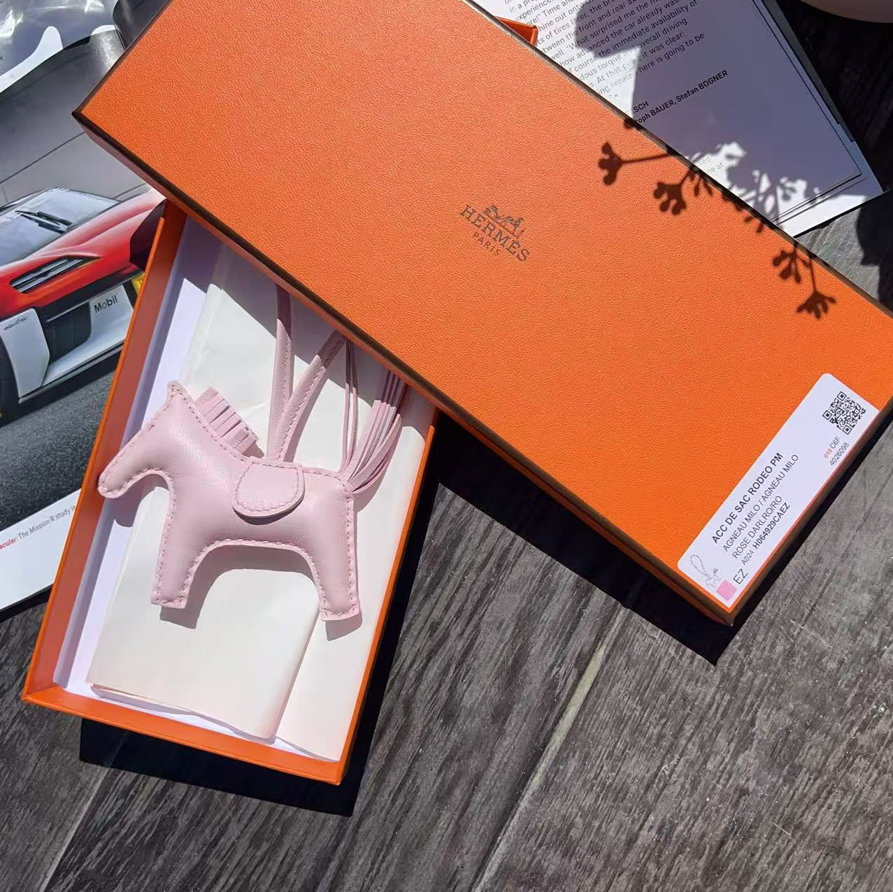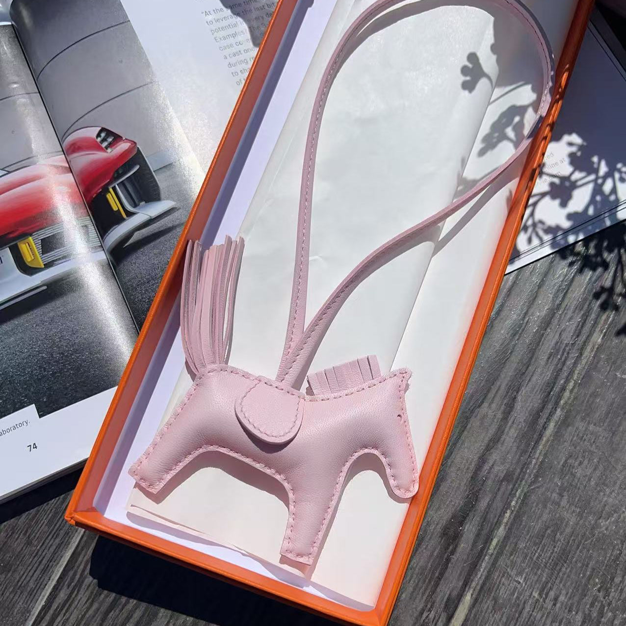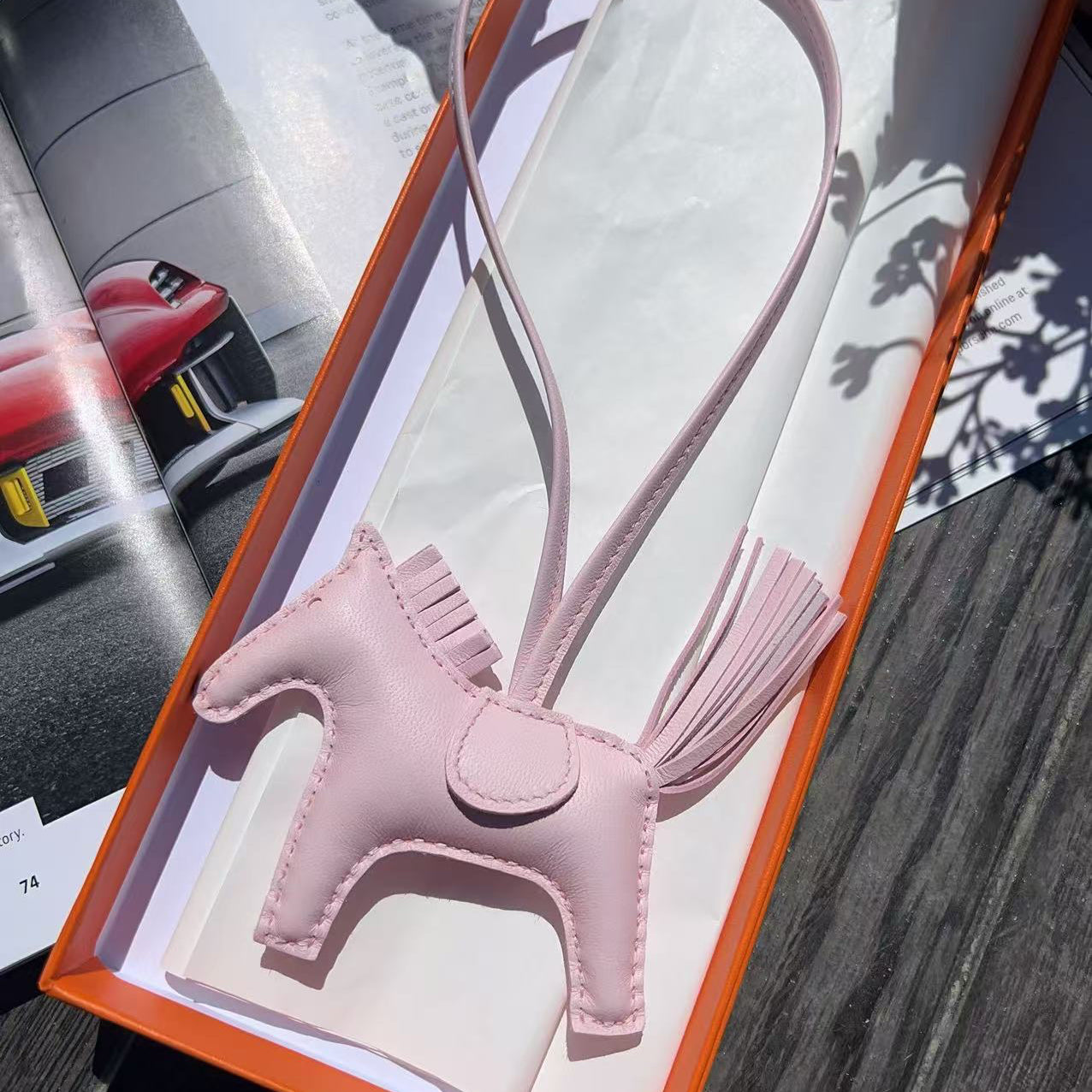 This Hermes Rodeo PM Milo Leather Horse Bag Charm of Rose Darling Milo Lambskin leather, featuring tonal stitching and matching saddle, loop holder, eyes, tail, and mane