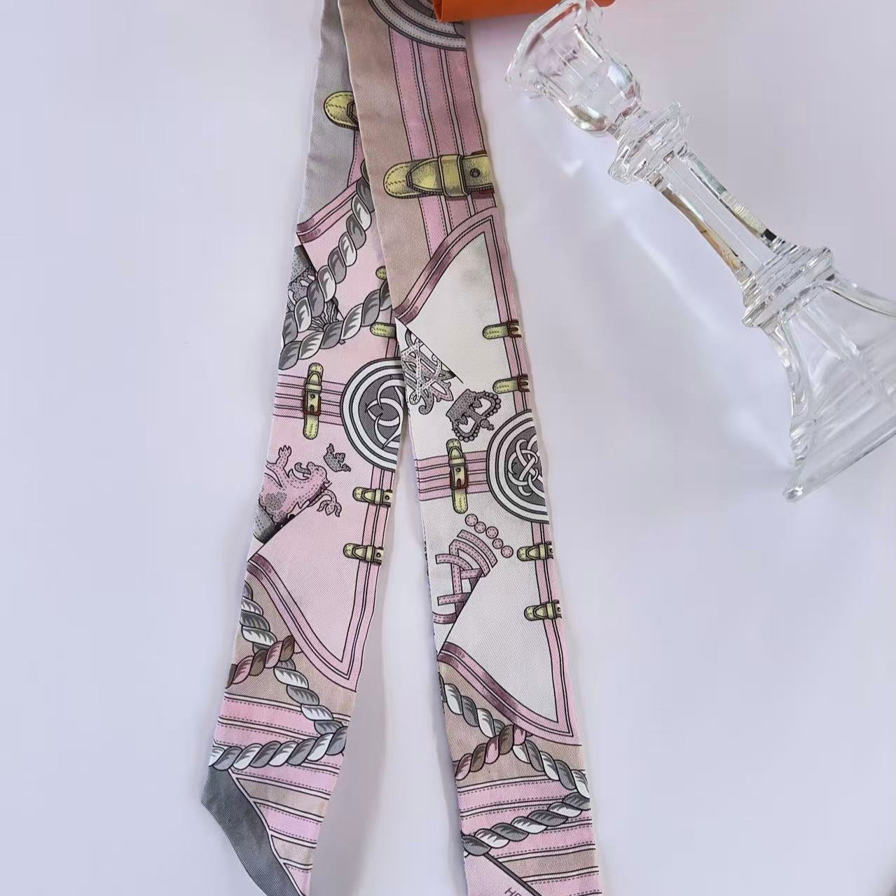 This is a Hermes Silk Grande Tenue Twilly Scarf Pink and Black. Which is a colorful silk twill weave scarf with decorative equestrian design. Wear this around your head, neck or your handbag for an added touch of classical sophistication from Hermes.
