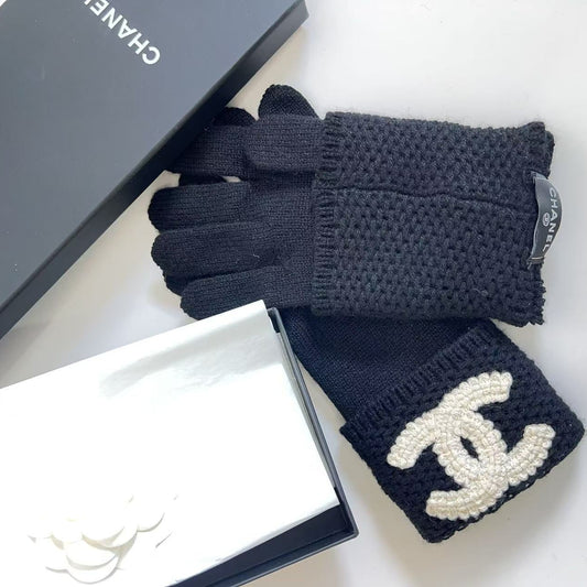Chanel Coco Mark Knit Gloves Cashmere Black White