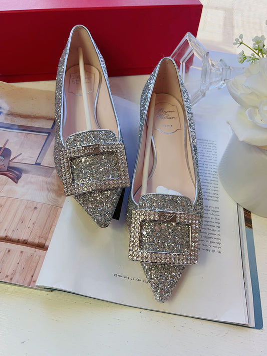 Roger Vivier Crystal-embellished glittered point-toe flats Size38