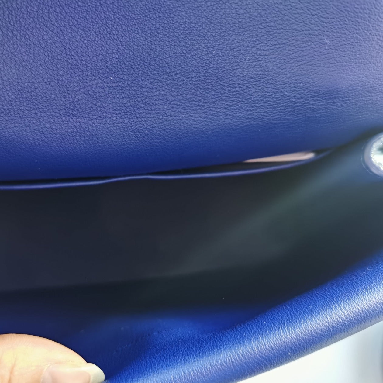 Dior flap bag in metallic Blue python. Palladium silver metal hardware. Hand carried and on the shoulder with a removable shoulder strap. It has two outside pockets and a special clasp pressure.