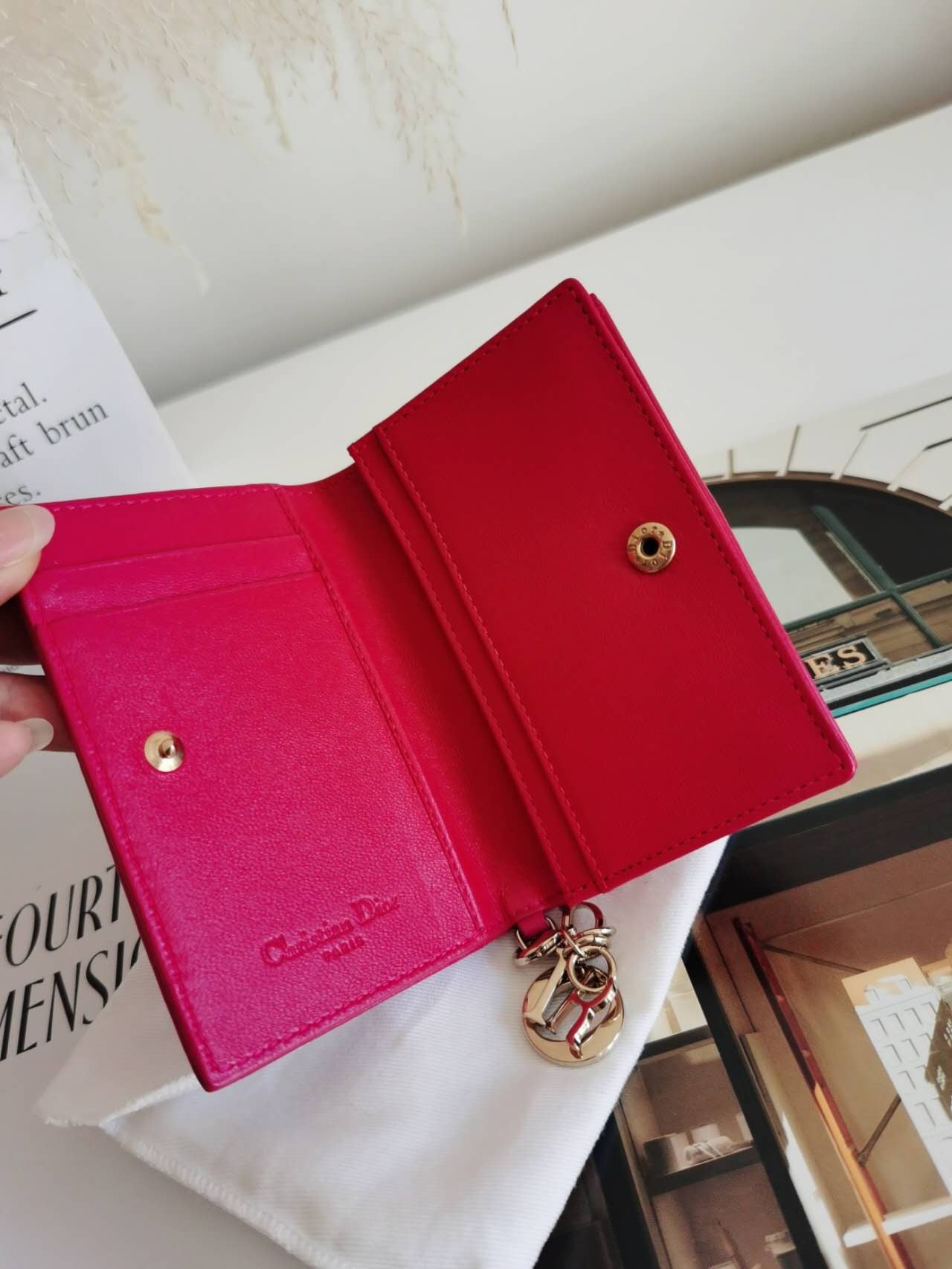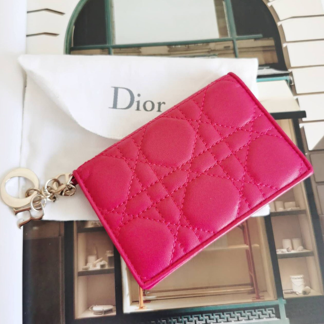 The Dior flap card holder honors the Lady Dior line's key features in bright pink lambskin with topstitching.