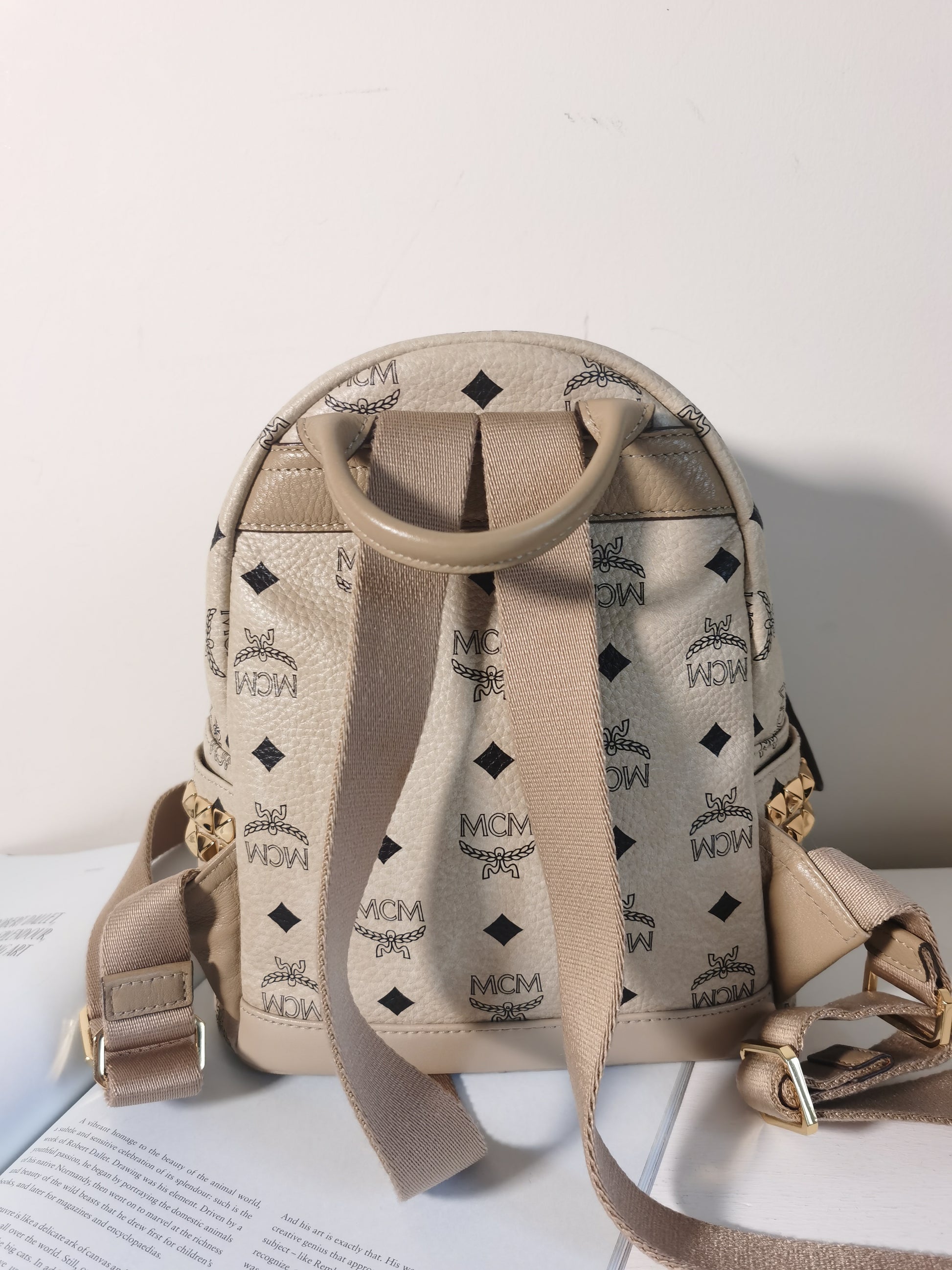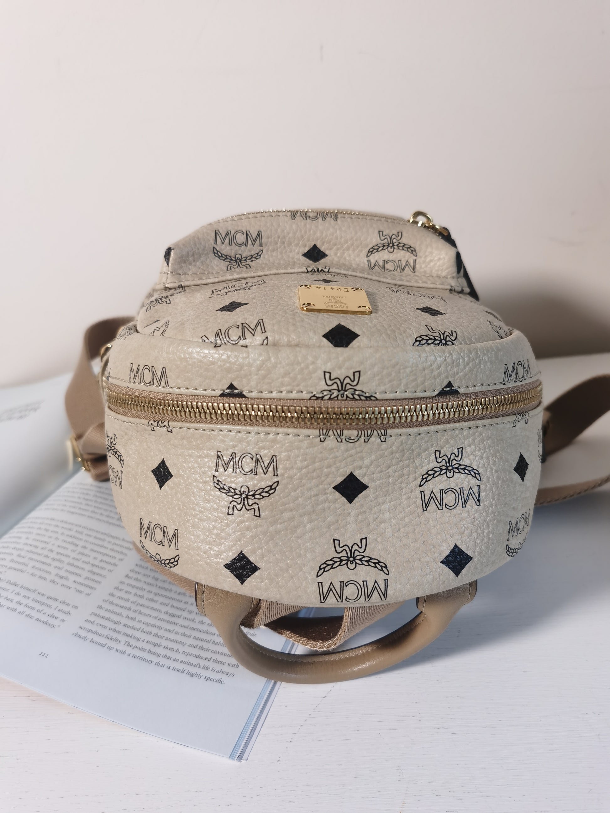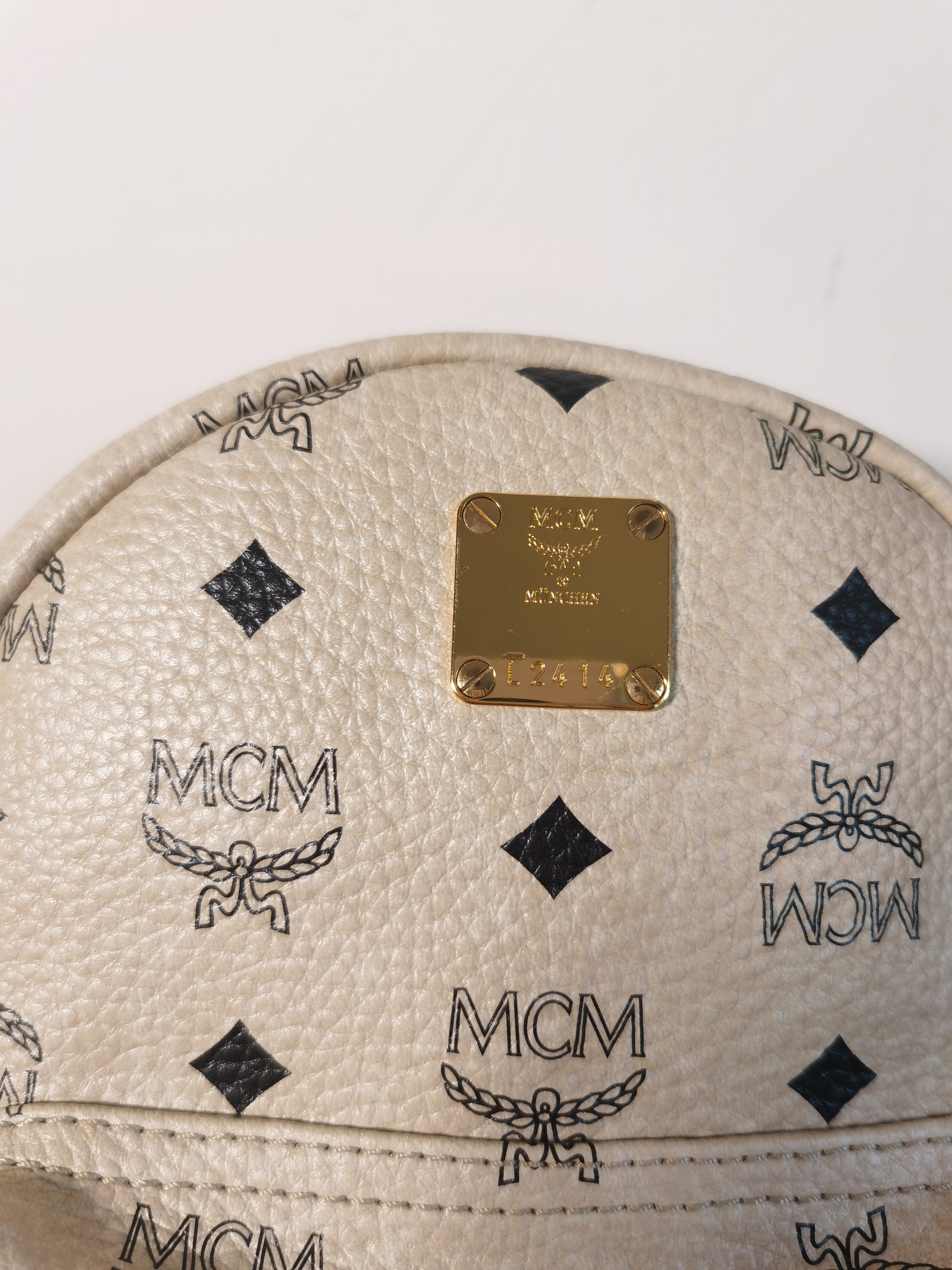 This is the Bebe Boo Stark Backpack. A micro sized version of an MCM icon. Approximately 3.9 x 6.9 x 8.3 inches
