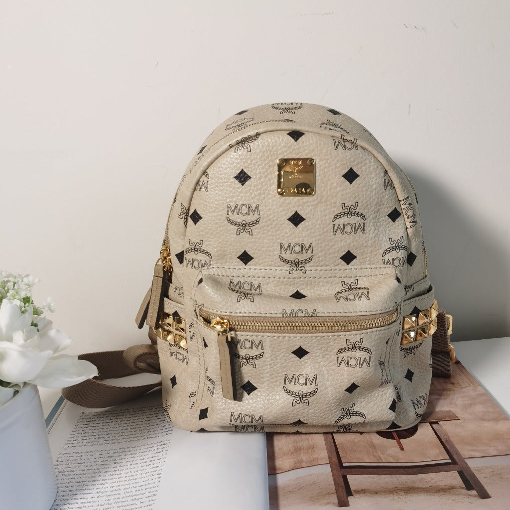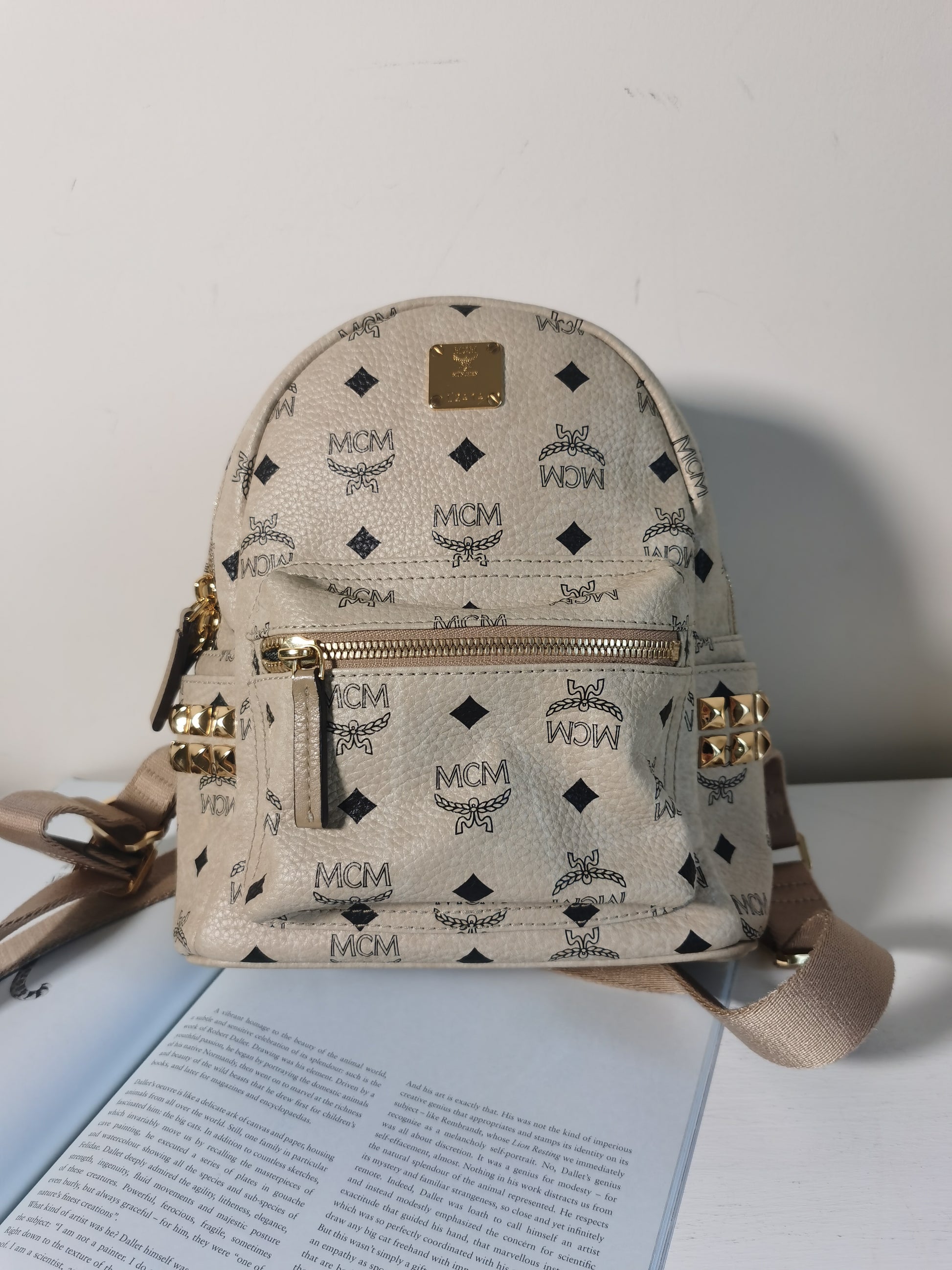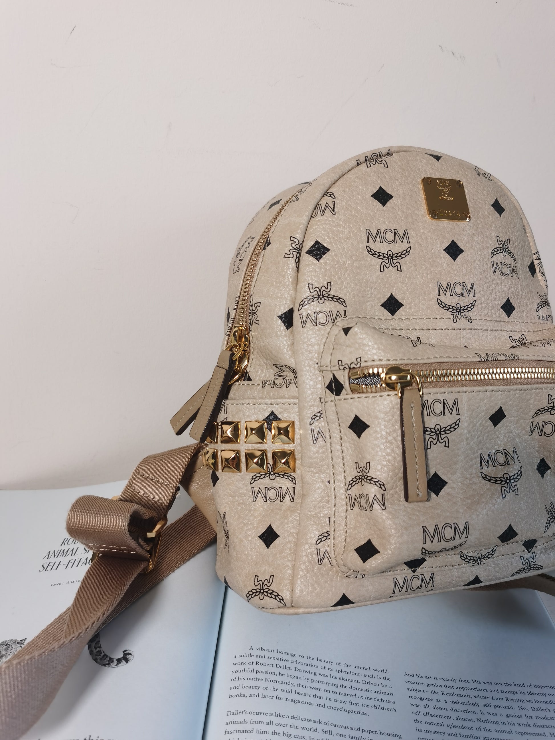 This is the Bebe Boo Stark Backpack. A micro sized version of an MCM icon. Approximately 3.9 x 6.9 x 8.3 inches