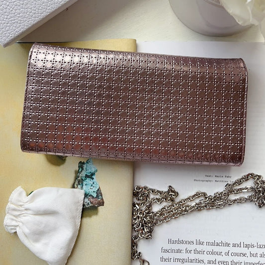 Dior Lady Dior Micro-Cannage Metallic Rose Gold Wallet On Chain New