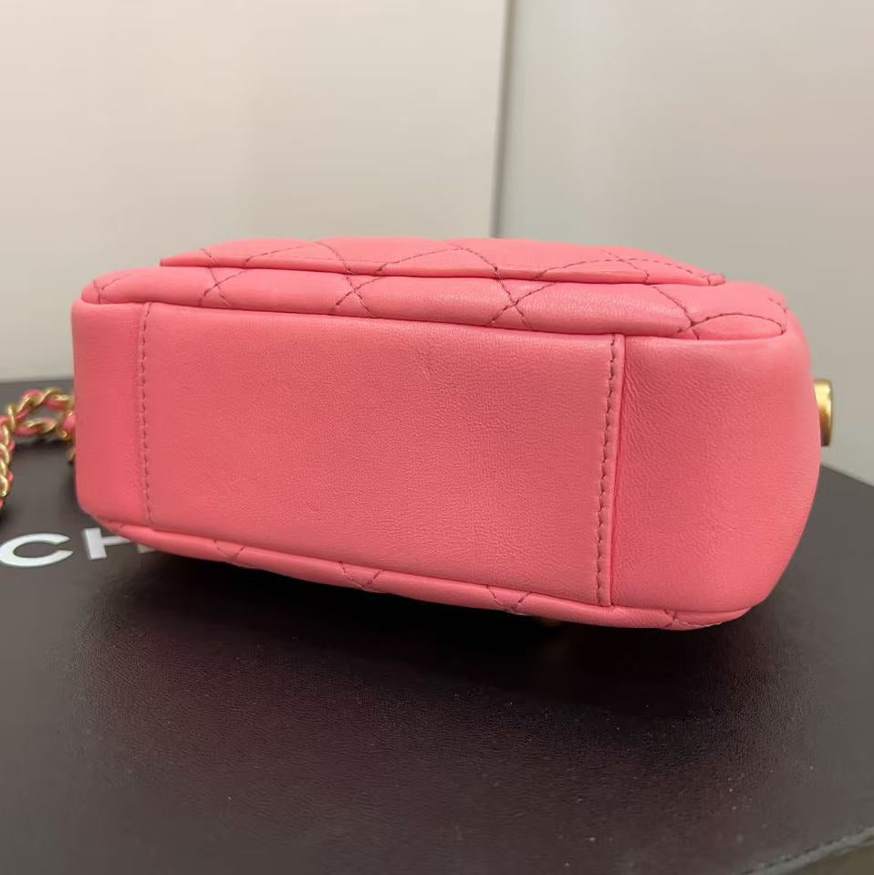 This is Chanel Quilted Lambskin Leather Pearl Crush Camera Crossbody Bag. It features gorgeous quilted lambskin leather with brushed goldtone metal CC logo. The versatile leather and chain strap can be worn cross-body or on the shoulder. The strap features a quilted metal CC 'pearl' charm. The interior is a micro size that can hold cards and cash.