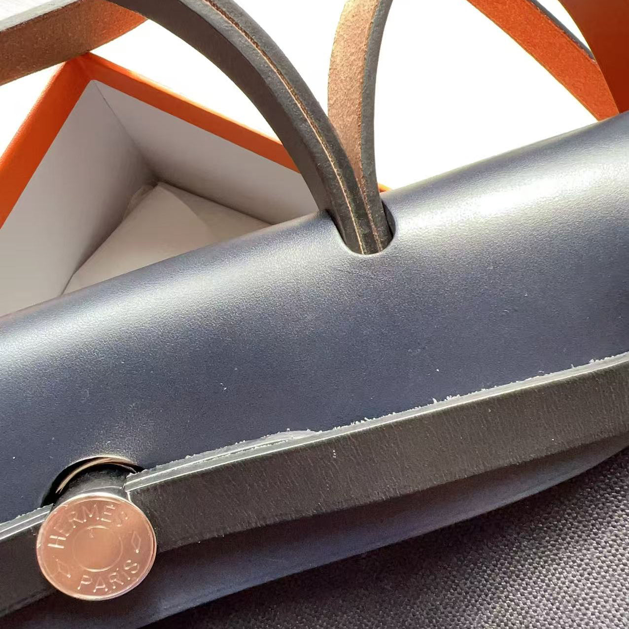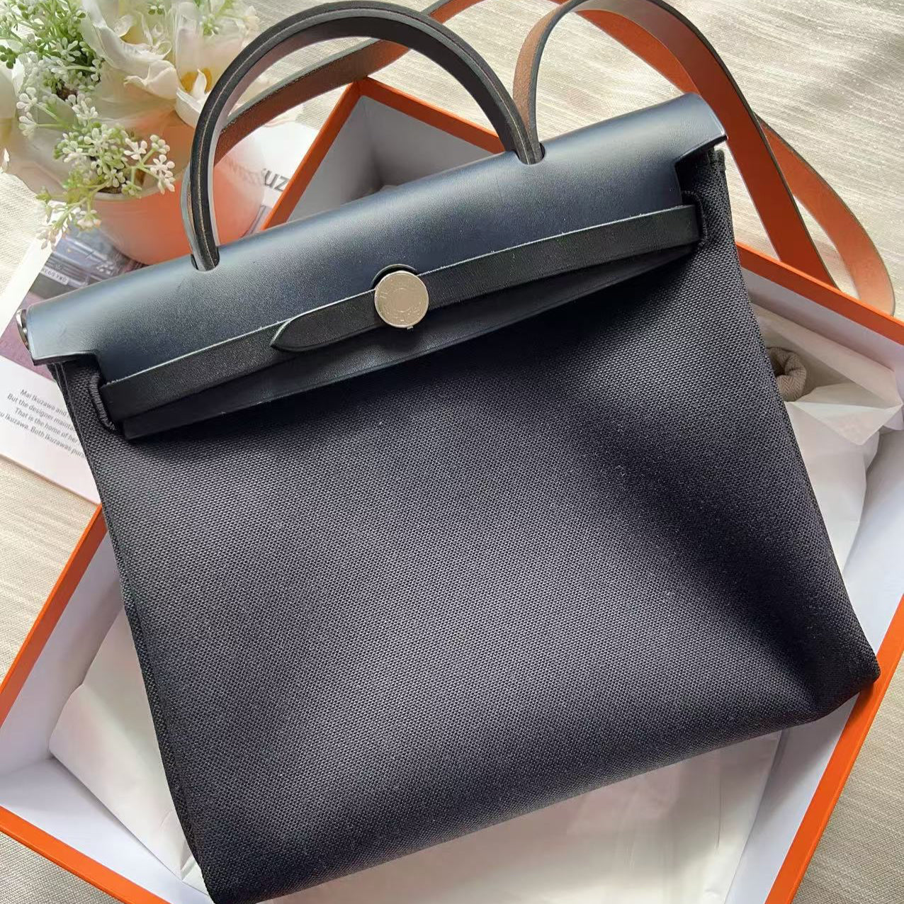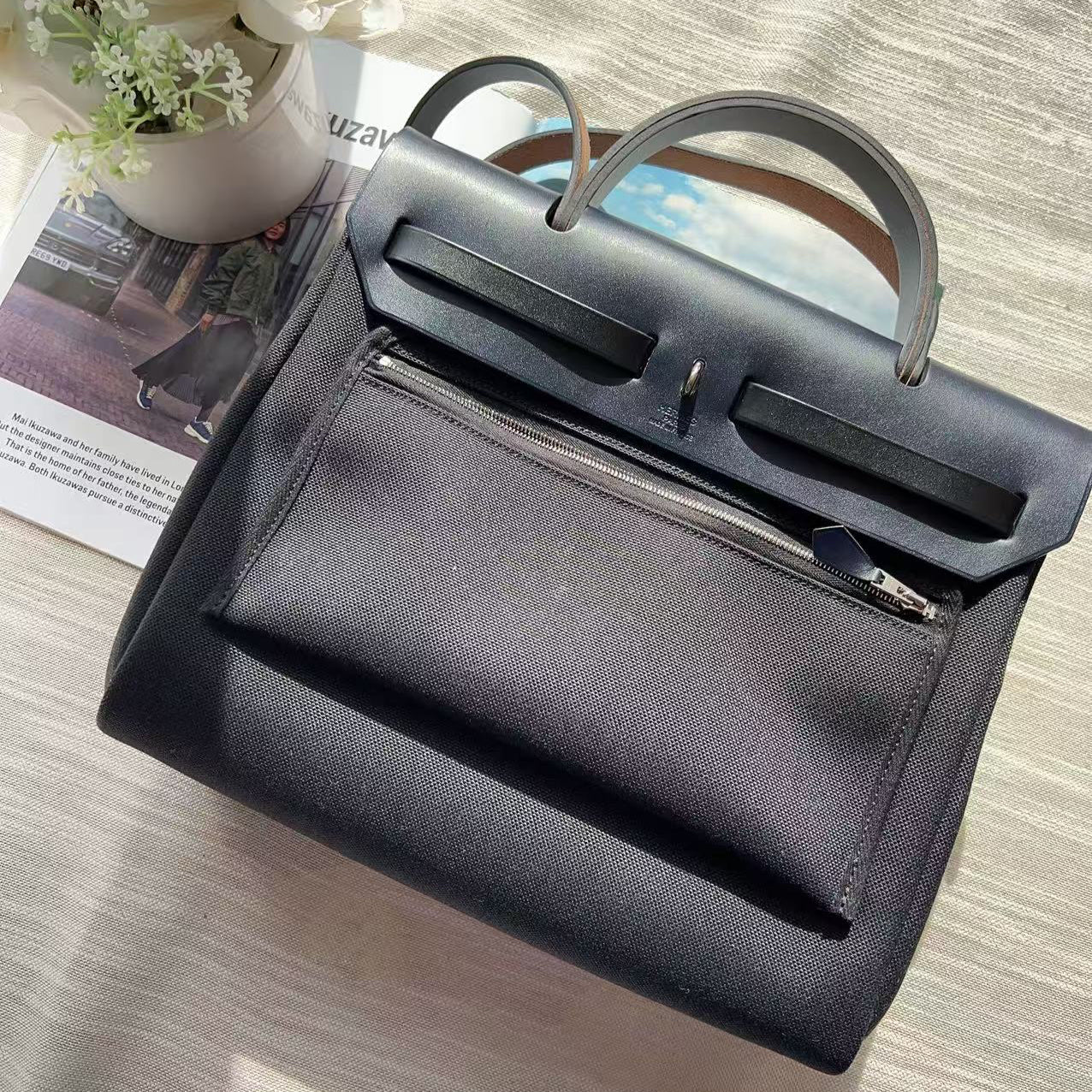 Hermes Herbag Zip Retourne 31 PM Toile Vache Hunter Black and Dark Blue PHW
