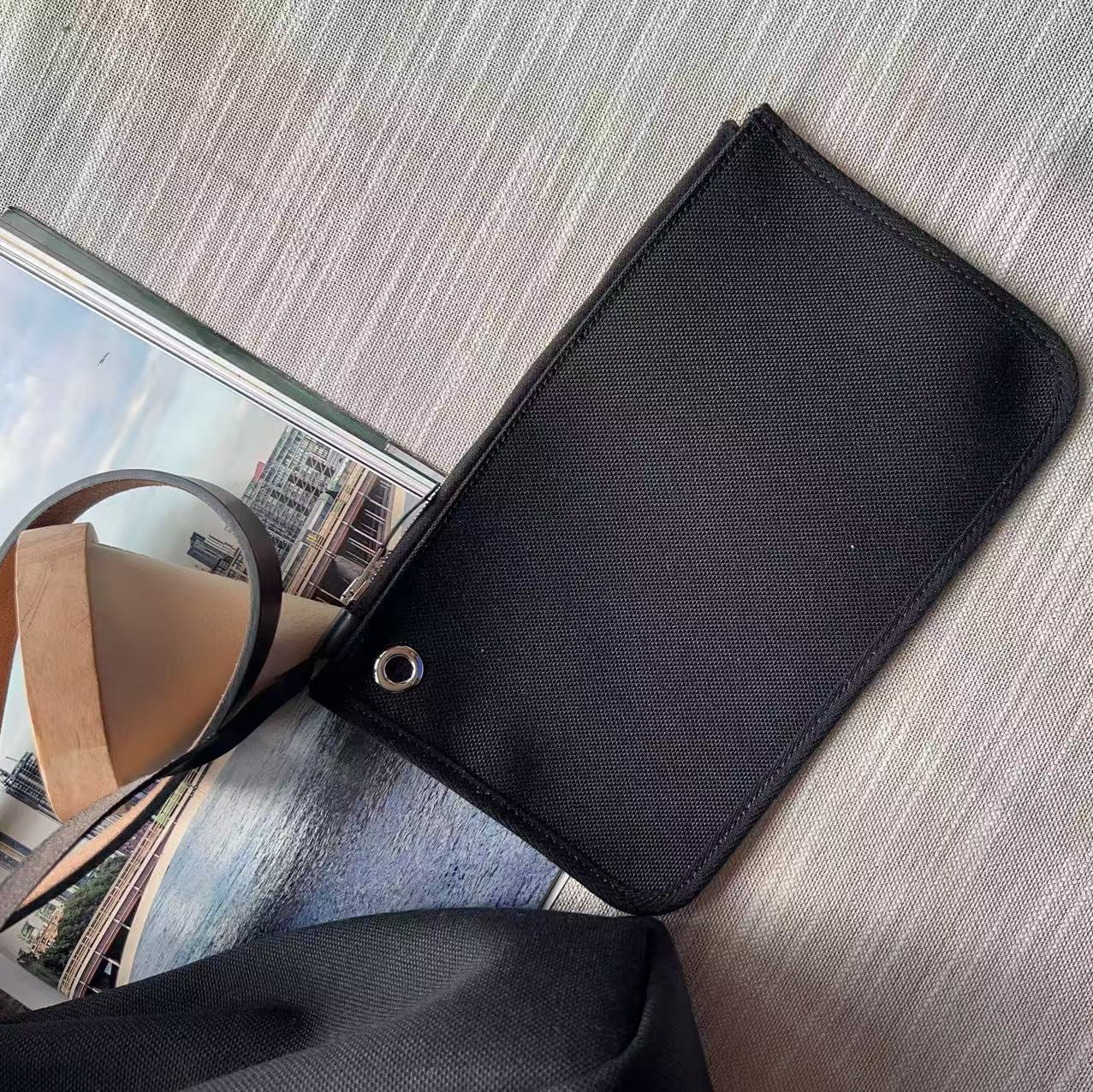 This is an authentic Hermes Zip 31 PM Toile Hunter in Black and Dark Blue. This stylish tote is made of sturdy toile canvas. The bag features a a rear exterior zip pocket, a black leather top crest with a leather top handle, shoulder strap, and strap closure with palladium silver hardware. This opens to a matching canvas interior with a removable pouch.