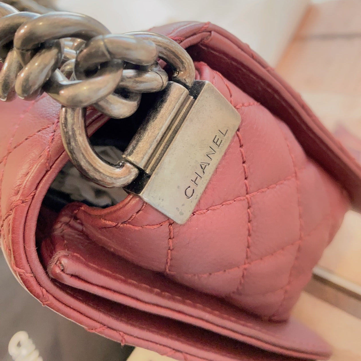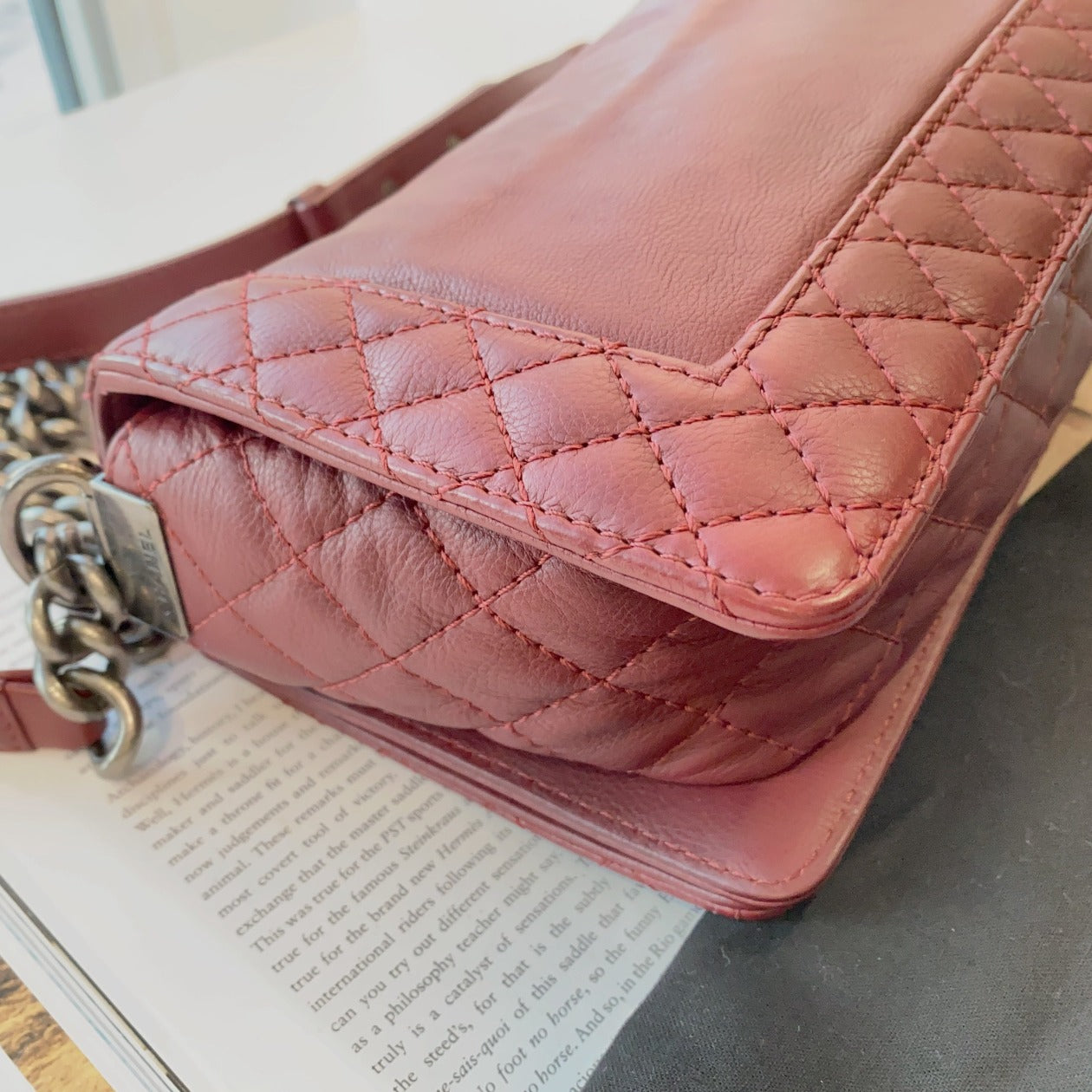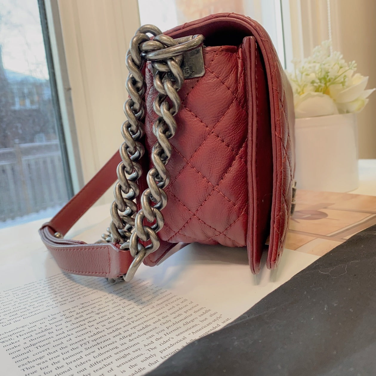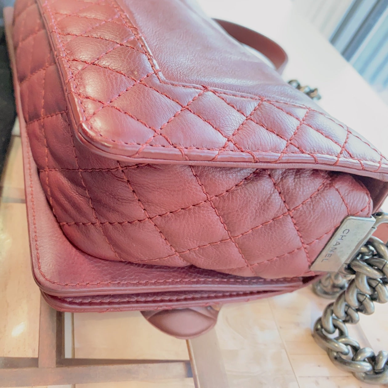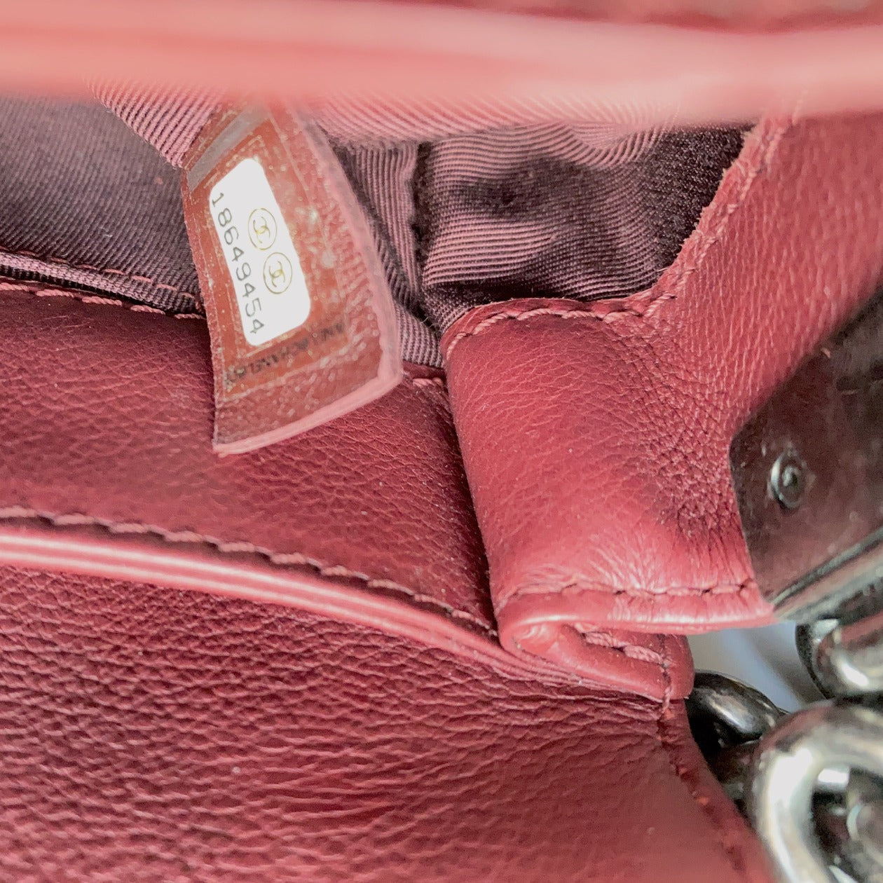 This is Chanel medium boy in burgundy grained leather and antique brushed silver hardware was manufactured in 2013 and 2014.