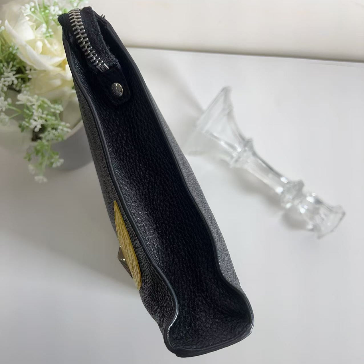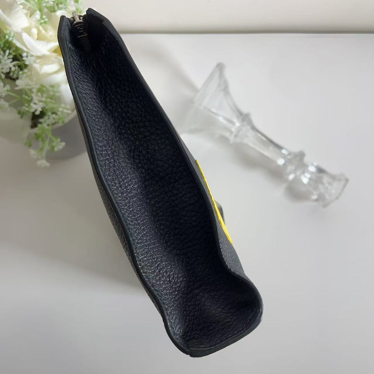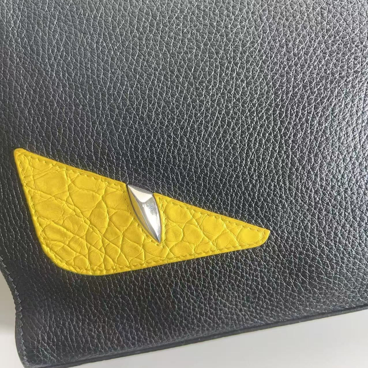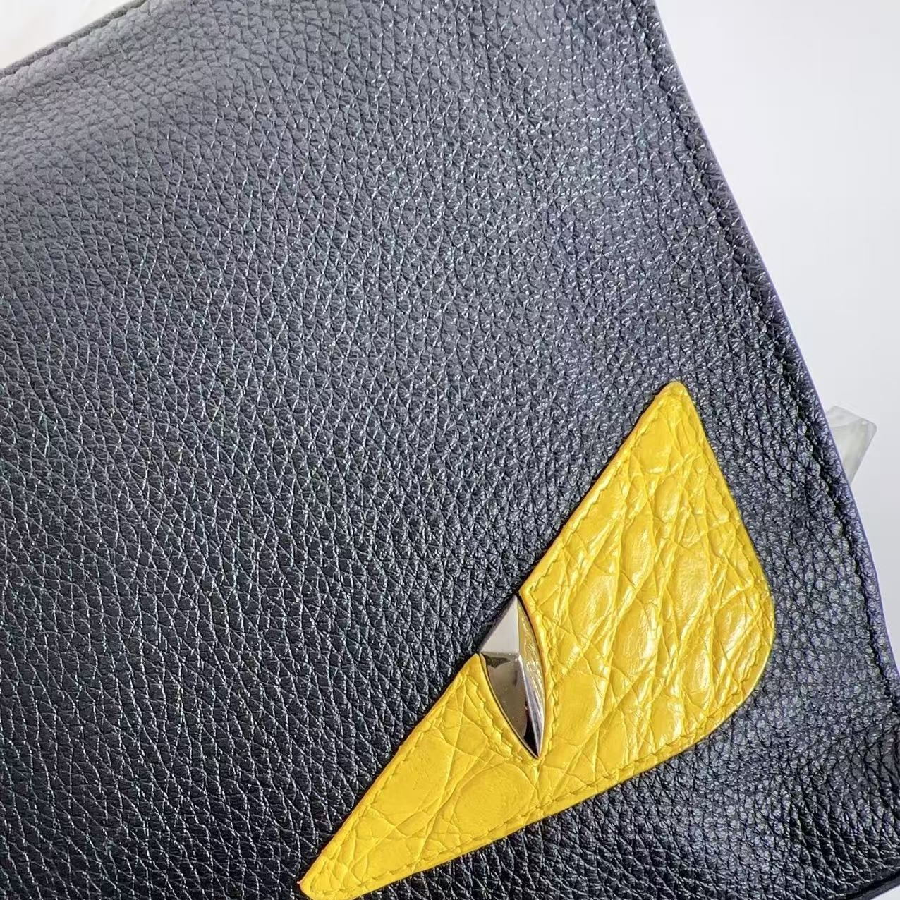This is an authentic FENDI Vitello Elite Monster Eyes Zip Pouch in Black and Yellow. This clutch like pouch is crafted of classic saffiano black leather with yellow saffiano patches creating the illusion of glowing eyes along with crystals on the eyes. This pouch unzips to a black fabric interior with room for all the necessary items