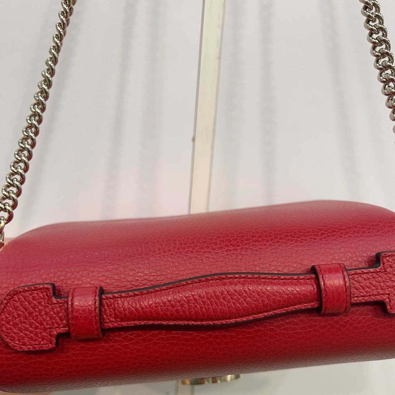 This is an GUCCI Dollar Calfskin Interlocking G Top Handle Shoulder Bag in Red. This chic shoulder bag is crafted of beautifully grained calfskin leather in red. The bag features a polished light gold chain-link shoulder strap with a red leather shoulder pad and a matching gold interlocking GG flip-lock on the crossover flap. This opens the bag to a partitioned beige fabric interior with both a zipper and patch pockets.