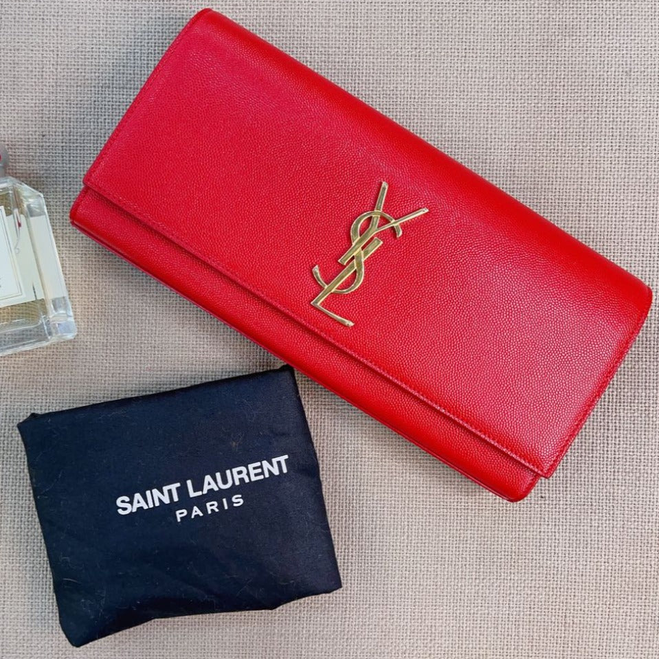 This is an authentic SAINT LAURENT Grain De Poudre Monogram Cassandre Clutch in Red. This chic clutch is crafted of grain de poudre textured calfskin leather in black. The front flap features a prominent brass classic YSL symbol which unsnaps and reveals a black fabric interior featuring a small leather flat pocket.